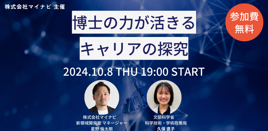 2024年10月8日、株式会社マイナビが主催する博士向けキャリアセミナー「博士の力が活きるキャリアの探索」に参加しました。文部科学省は多様で卓越した研究を生み出すために、「博士課程の処遇向上」と「博士学生のキャリアパス(活躍の場)の拡大」に注力しています。本セミナーでは、博士をとりまく現場や課題に対し、文部科学省を中心とした産学官でどのように対応していくのかが語られました。博士学生の処遇とキャリアパスについて、これからどのように展開されていくのか、文部科学省の方のお話をお届けします。