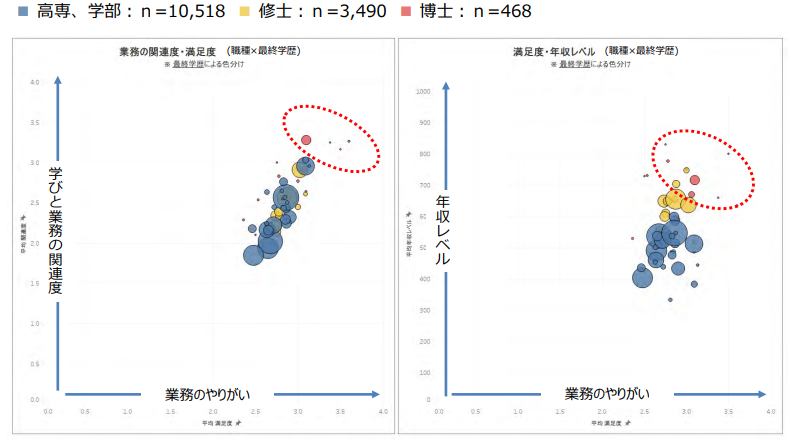 いずれの職種においても、業務との関連度や年収、やりがいは、高専・学士や修士よりも博士の方が高い傾向にあります。さらに、20代の技術系研究職では最近、博士の年収レベルが上昇しており、高年収かつやりがいの高い博士人材の層が生まれてきています。