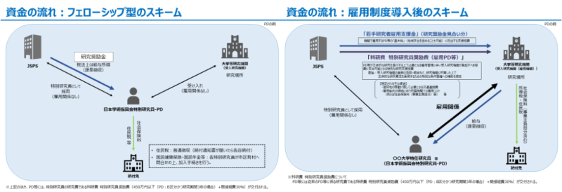 ポストドクターでは、特別研究員制度のPDというスキームがありますが、従来は雇用関係のない状態で研究機関に所属することになっています。雇用関係にないため、社会保険料の支払いが成立せず、個人事業主としての負担が大きいことが問題となっていました。今後は機関ごとに勤労関係を構築することで、PDの処遇を改善していきます。