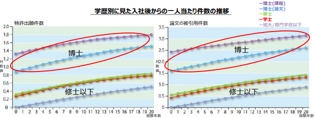 特許出願件数と論文の被引用件数について、入社後の推移を学歴別に見てみると、博士は修士以下に比べて件数が多いです。また入社時点から、博士と修士以下で差がついています。このことから、修士を採用して博士号取得を支援するよりも、課程博士を採用した方が研究の生産性が高くなる傾向にあると言えます。