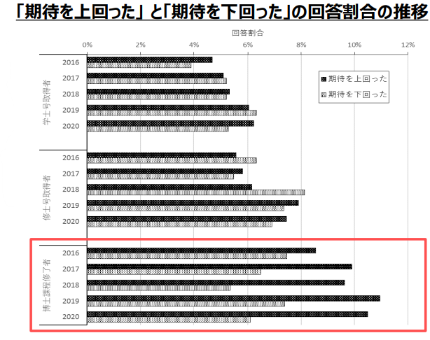 「期待を上回った」と回答する企業の割合が、学士や修士よりも博士は高いです。また、「期待を上回った」と「期待を下回った」それぞれの回答割合の推移を見てみると、経年的に見ても博士人材の評価は高まる傾向にあります。イノベーションを創出できるような研究力という点で、博士人材の活用について期待を上回ったと考えられます。