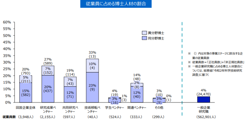 また、大学発ベンチャー企業での従業員に占める博士人材の割合は、回答全体で2割程度となっています。一般企業では4%しかいないので、その5倍の博士人材が大学発ベンチャーで活躍していると言えます。