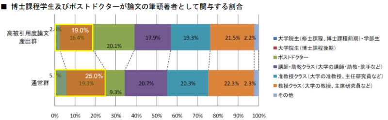 論文の筆頭著者の割合を見てみると、修士学生と学士学生を合わせても3~5%であるのに対し、博士学生は16~20%となっており、博士学生が論文の生産量を担っている状況にあります。また、博士学生が筆頭著者である高引用度論文数も16%と高いことを鑑みると、博士学生が質の良い論文を書いていると言えます。